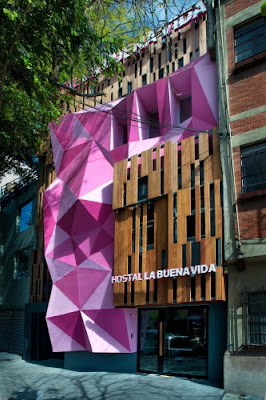 Filled with color and texture, here's a hostel located in one of my favorites sectors in Mexico City, La Condesa. An eye catcher for the contemporary urban traveler with a pink double skin facade, the hostel La Buena Vida does stand out from it's neighboring buildings.